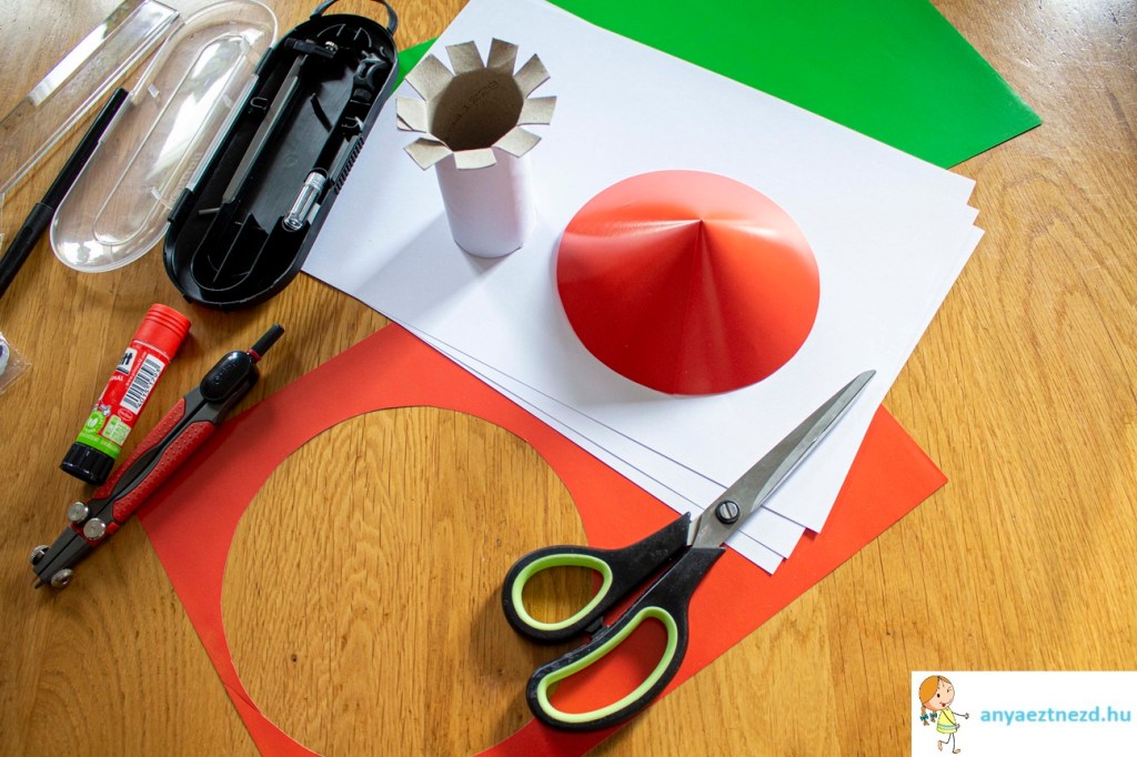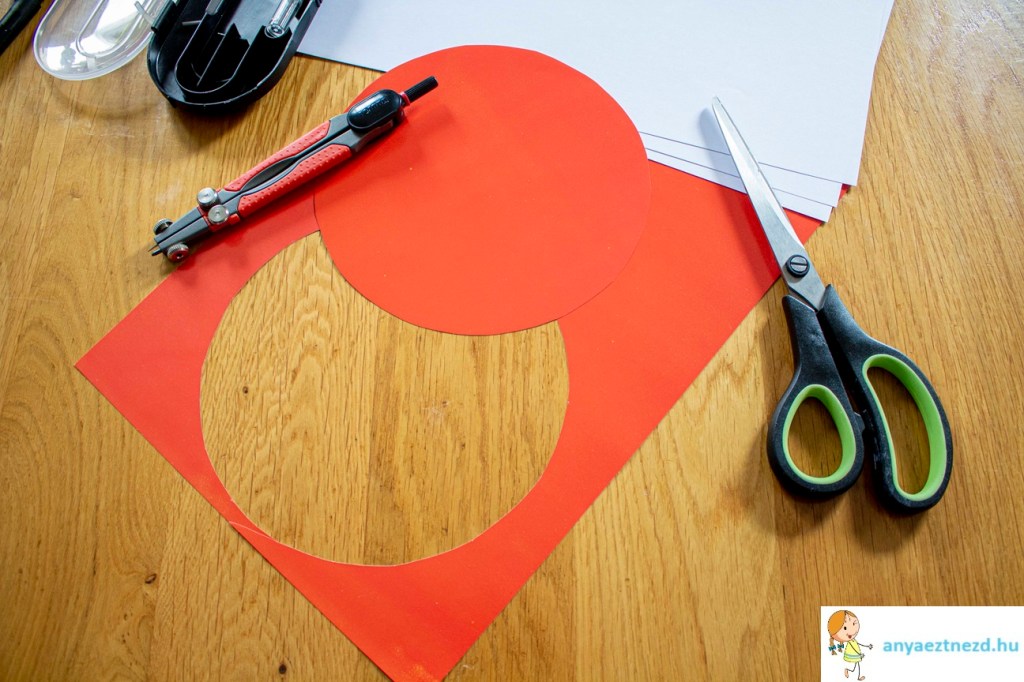 A piros színeslapra rajzoljunk egy 6-7 cm átlójú kört és vágjuk ki. Ez lesz a gomba kalapja.