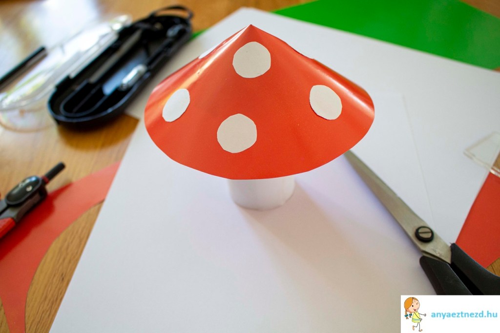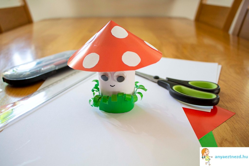 Ragasszuk fel a füvet a henger aljára, a szemeket pedig a kalap alá. Ha nincsenek mozgó szemeink, filctollal is megrajzolhatjuk a gomba arcát.