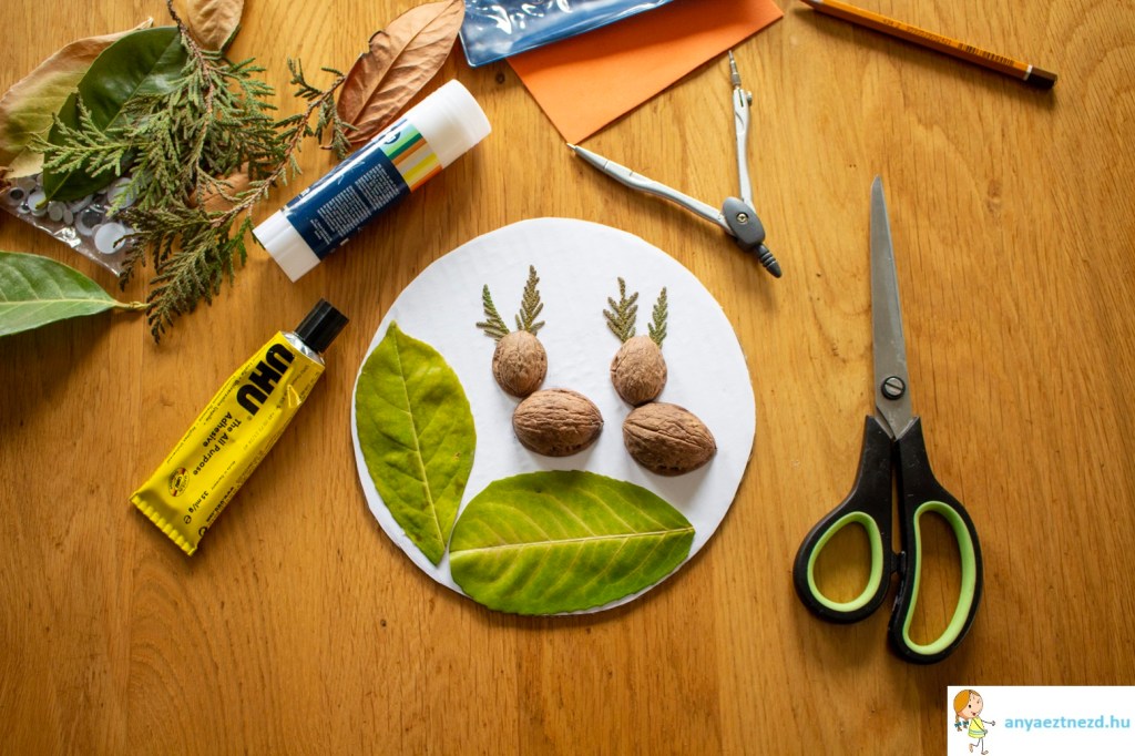 Érdemes a tuja-agancsokat a dióhéj-fej alá ragasztani, hogy úgy tűnjön, mintha onnan “nőnének”.
