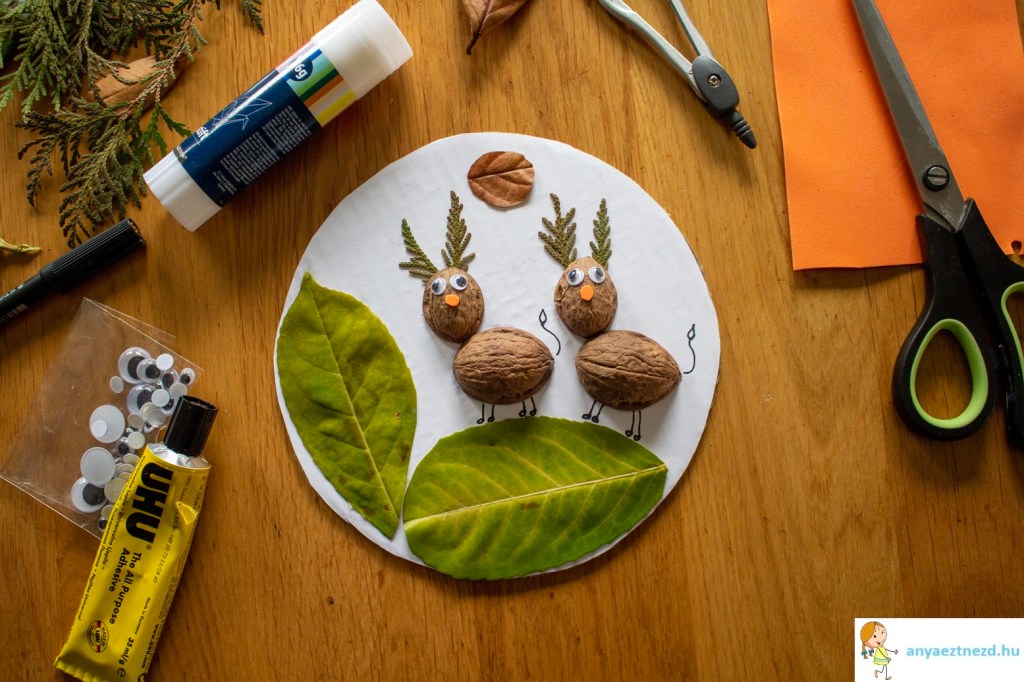 A négy dióhéjat és a tujafaágakat is felragasszuk a képen látható módon.