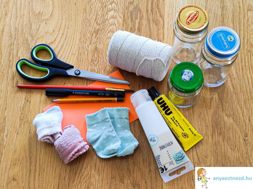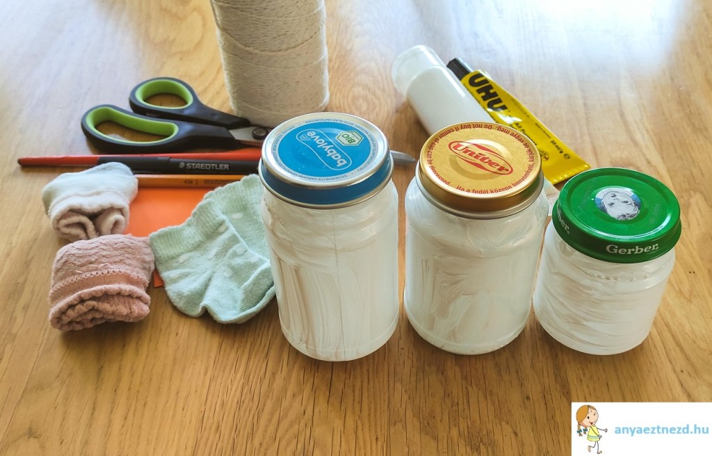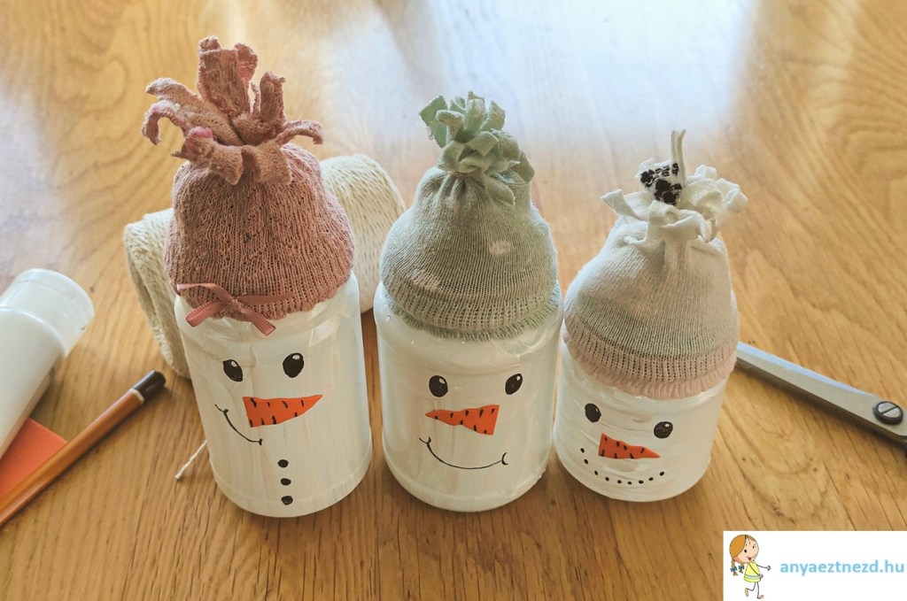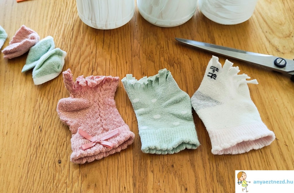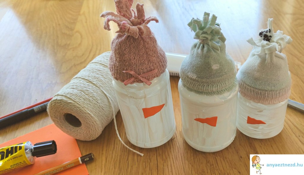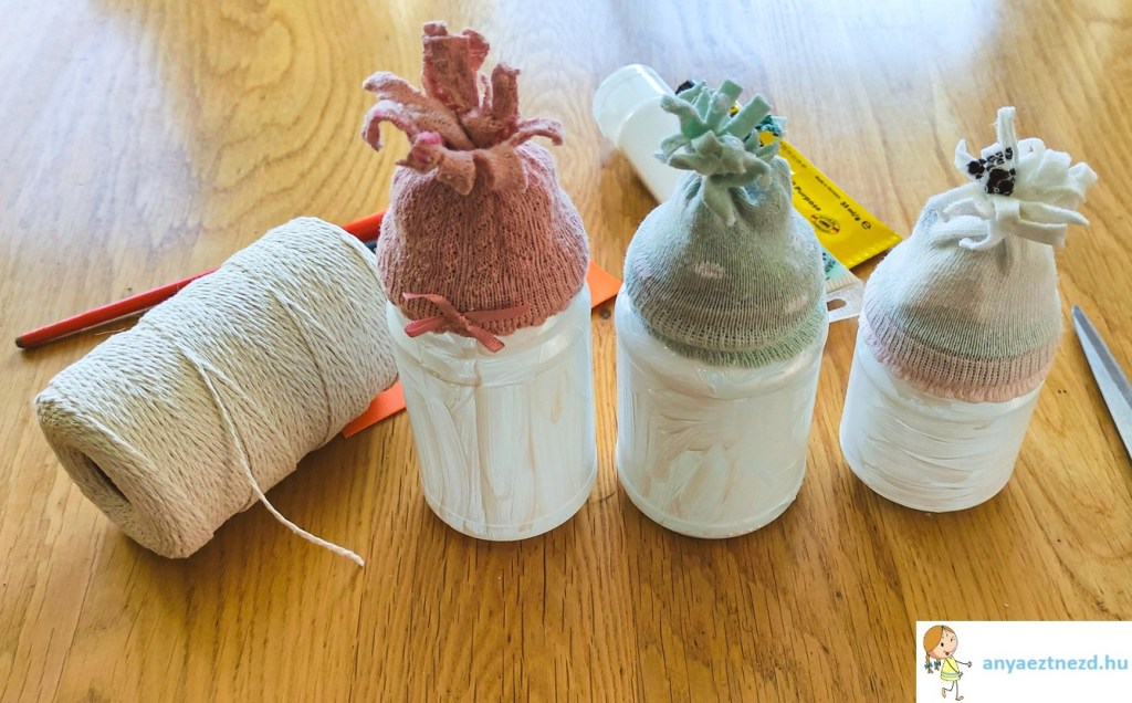 A zoknikat húzzuk rá az üvegek tetejére és a szebb összhatás kedvéért tömjük ki őket papirgalacsinnal vagy vattával, de akár a zokni párját is beletehetjük. A madzaggal kössük felül össze, közvetlenül a bevagdosott rész alatt.