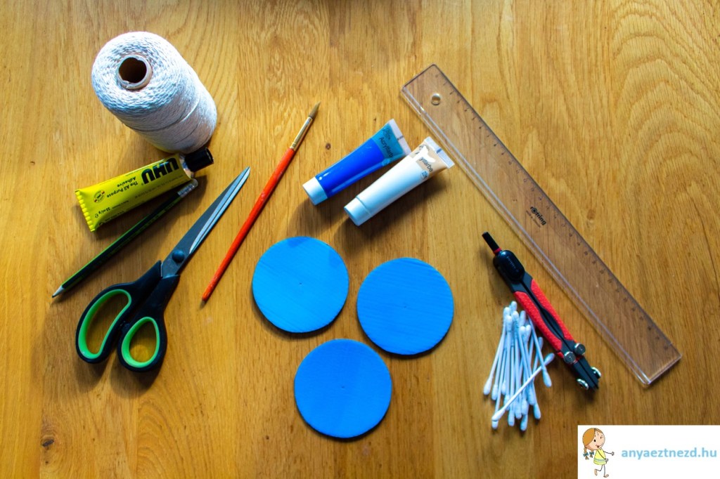 A kartonpapírra rajzoljunk fel és vágjunk ki 8-9 cm átmérőjű köröket, majd fessük be őket világoskékre.