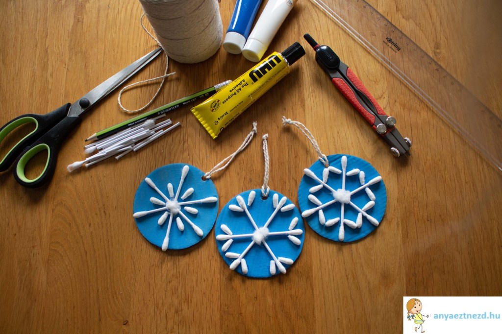 Ha a ragasztó megszáradt, fúrjunk lyukat a karikák szélére és a madzaggal kössünk rájuk akasztót.