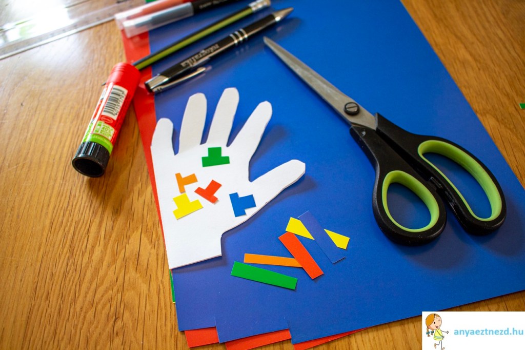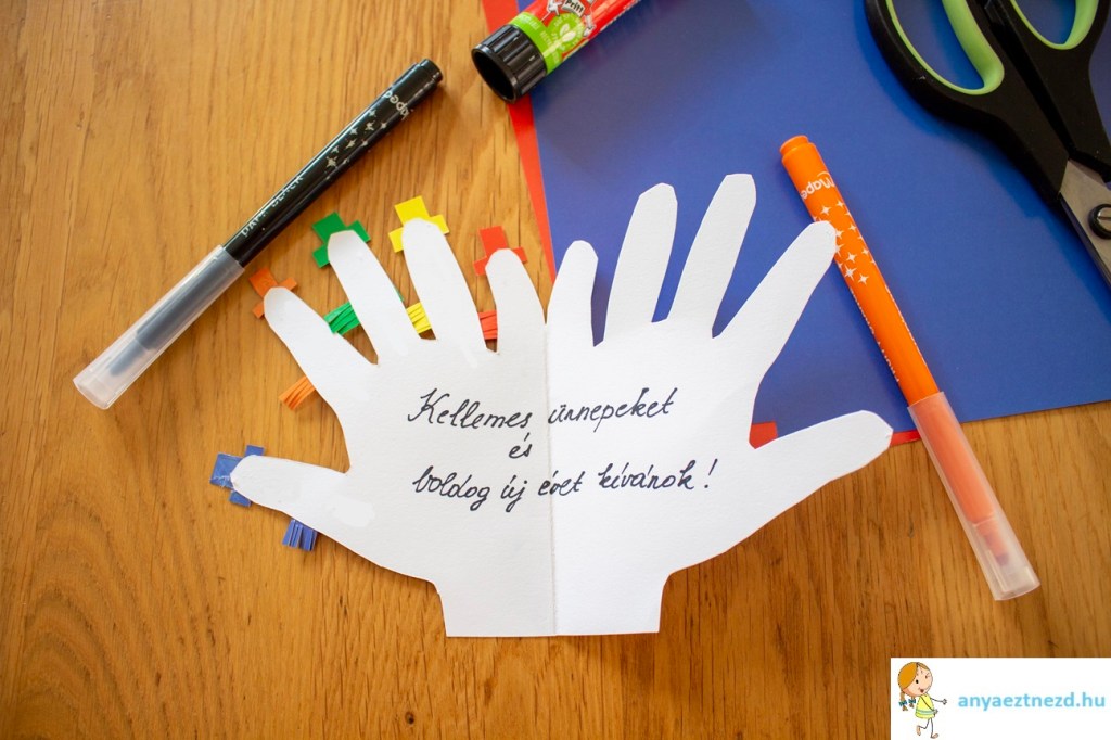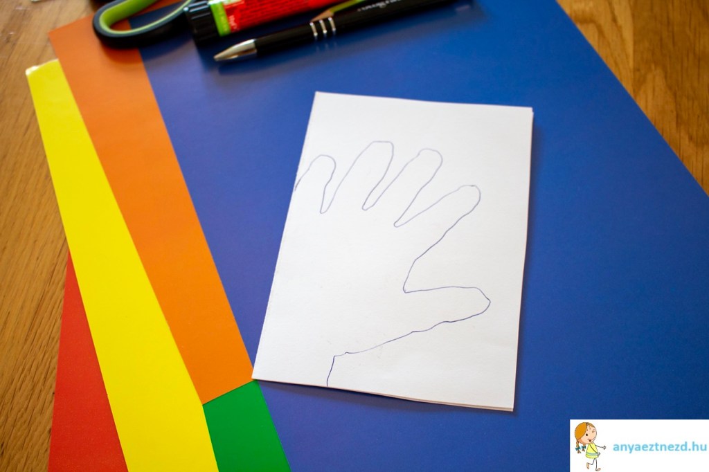 A fehér kartonpapírból vágjunk ki egy nagyjából 20×15 cm-es téglalapot, hajtsuk félbe és rajzoljuk rajta körbe a gyerek kezét úgy, hogy a hajtott oldalához hozzáérjen a tenyere széle.