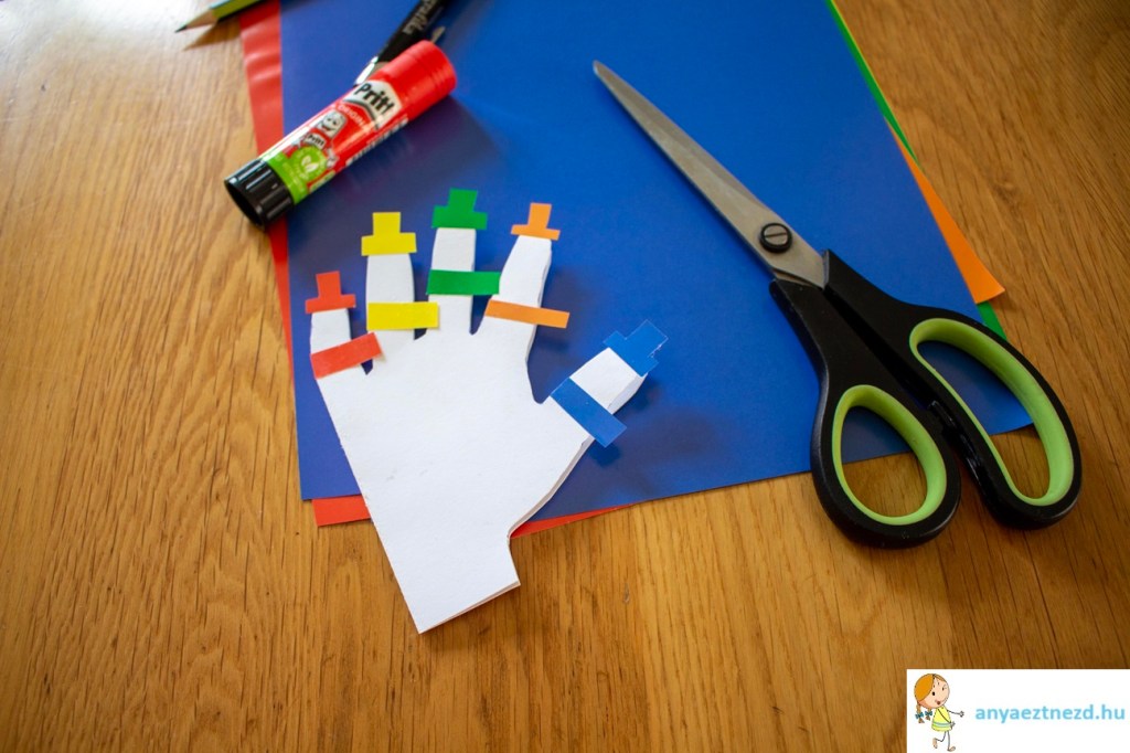 Minden ujj tetejére ragasszunk fel egy “kalapot”, úgy, hogy az ujj hegyét teljesen eltakarja, majd valamivel lejjebb ragasszuk fel a csíkokat is, úgy, hogy csak az egyik oldalon lógjanak túl.