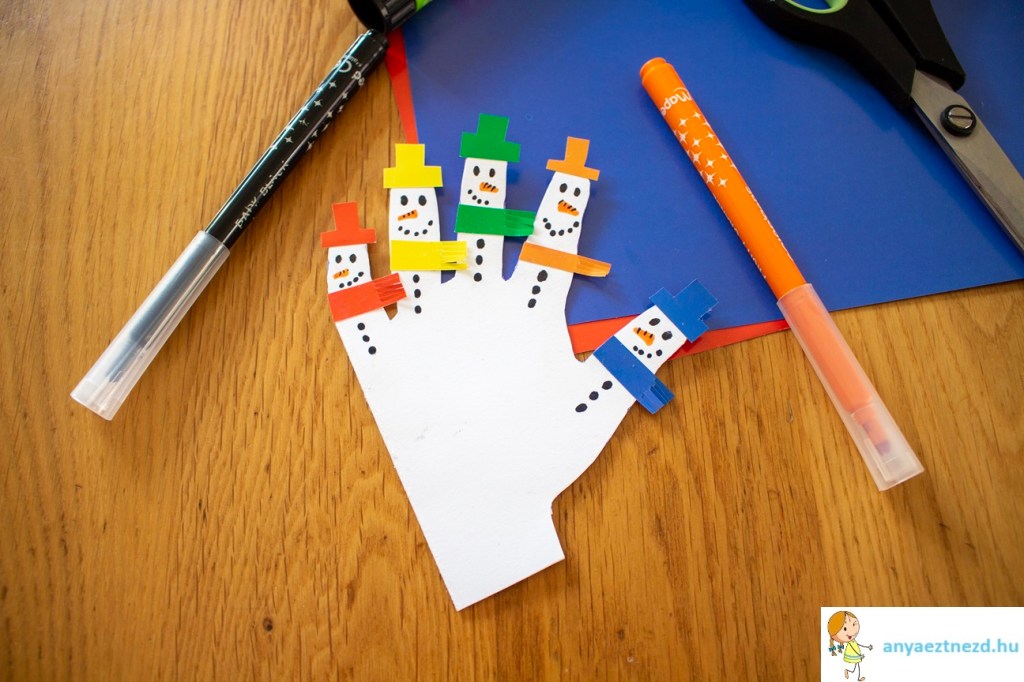 A fekete és a narancssárga filctollal rajzoljuk meg a hóemberek szemét, száját, orrát és a gombjait, majd vagdossuk be a színes csíkok túllógó végét, hogy rojtos sálnak látszódjanak.