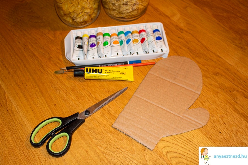 A kartonra rajzoljuk fel az egyujjas kesztyű körvonalát, majd vágjuk ki. Ha nem akartok vagy nem tudtok szabadkézzel rajzolni, akkor alul találtok egy letölthető körvonalat, amit használhattok. 🙂