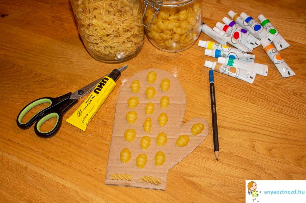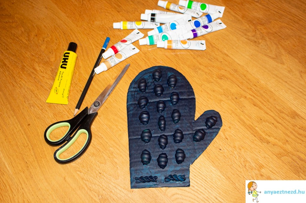 A temperával fessük ki a kesztyűt és a felragasztott tésztákat is.