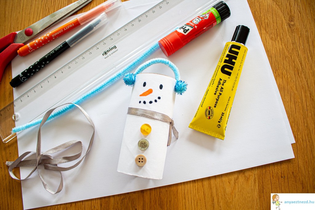 A folyékony ragasztóval a pompomokból és a méretre vágott pipatisztító keféből ragasszuk fel a hóember fülvédőjét, majd a gombokat és a szalagot is úgy, hogy a végeit összekötjük (sálat imitálva).