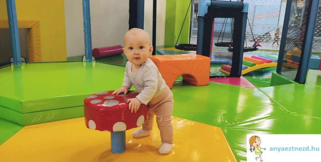 A Kicsi is nagyon élvezte a műanyag labdákat és színkavalkádot, mindent alaposan összetaperolt és megnézegetett, sőt, egy számára tökéletes magasságú szivacsgombába kapaszkodva itt állt fel először teljesen egyedül!