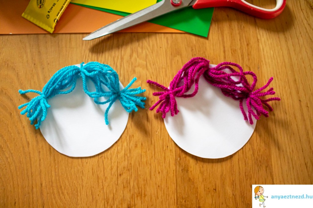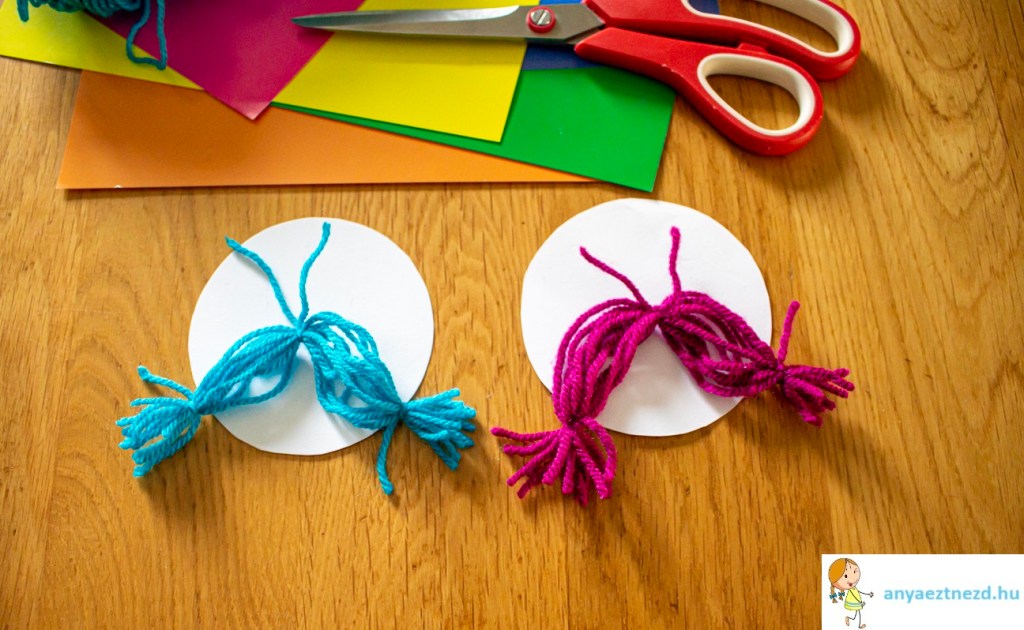 A fonalhajat ragasszuk fel a kör szélére három ponton (ahol összekötöttük a szálakat). Én a középső csomónál fúrtam egy lyukat és “rákötöttem” a kartonpapírra, hogy biztosan a helyén maradjon.
