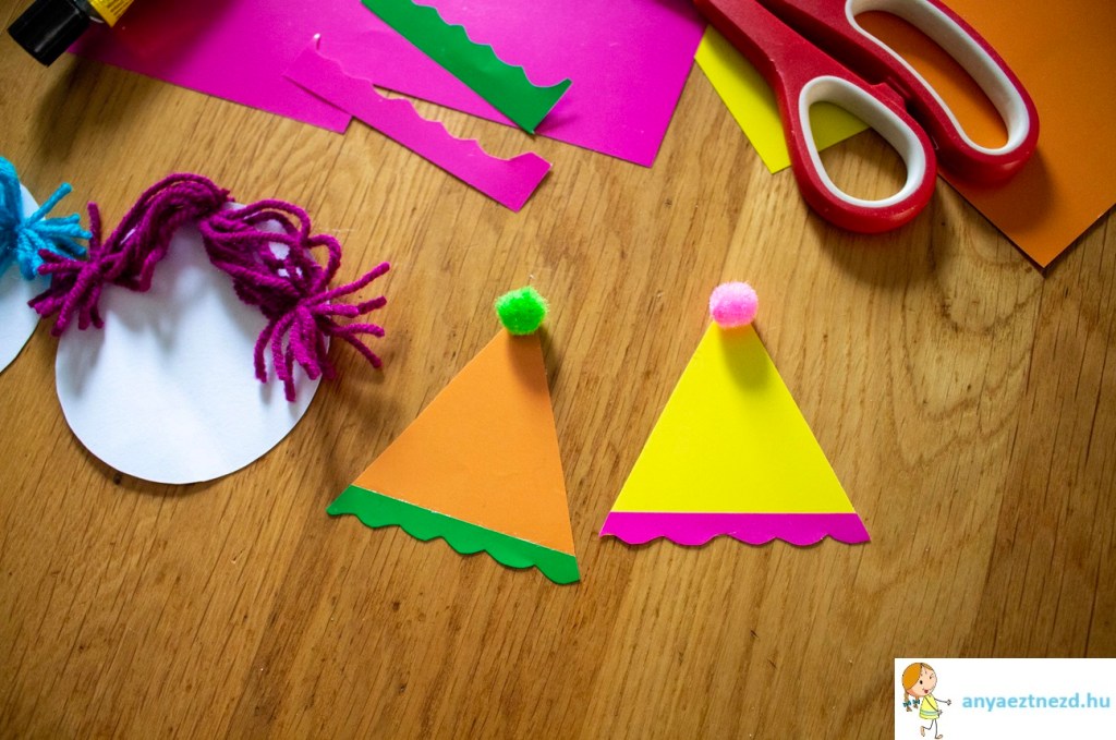 A csúcsára ragasszuk egy pompomot vagy vágjunk ki egy kisebb kört egy tetszőleges színes papírból.