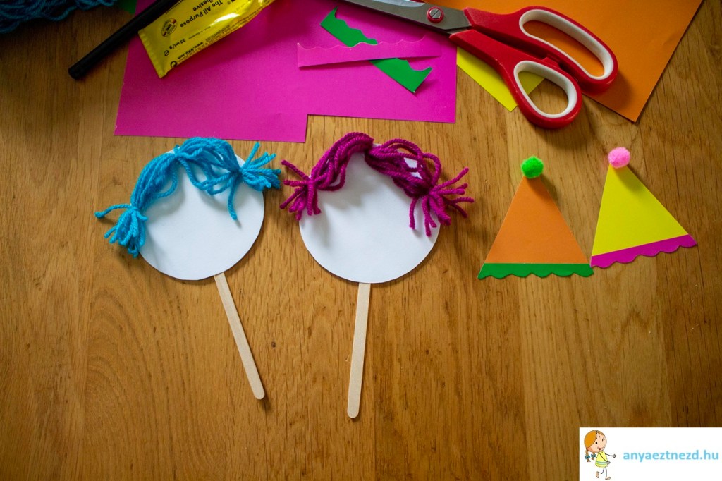 Ha megszáradt a ragasztó a bohóc hajánál, akkor a fej hátuljára ragasszuk fel a jégkrémes pálcikákat.