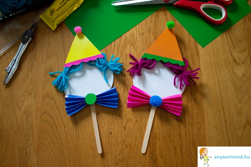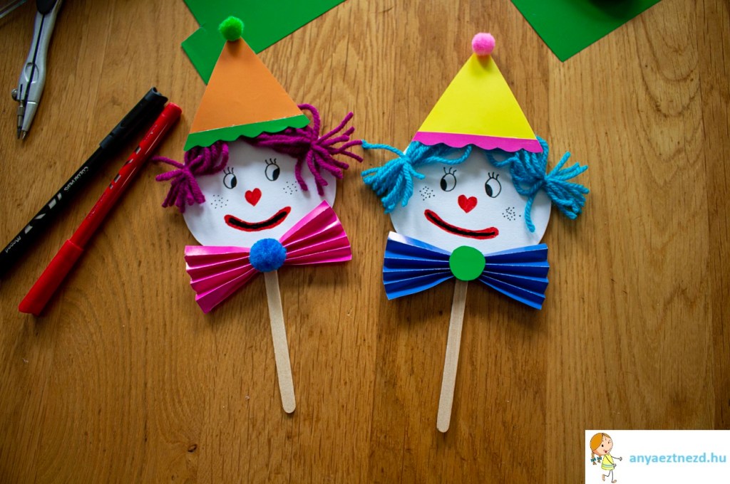 Ha minden alkotóelem elkészült, akkor ragasszuk fel a csákót és a csokornyakkendőt a bohóc fejére.