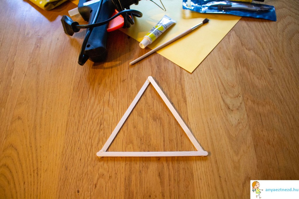 A három jégkrémes pálcikát ragasszuk össze háromszög alakban. Ha a ragasztó megszáradt, a sárga temperával fessük be a pálcikákat. Amíg szárad, elkészítjük a csirke többi részét.