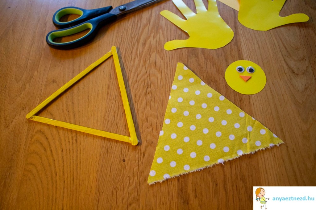 A sárga mintás textilből vágjunk ki egy akkora háromszöget, ami a jégkrémes pálcikák külső oldalával megegyező méretű.
