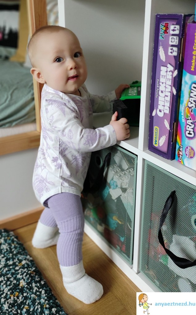 Folyamatosan emeli a tétet, újabban úgy igyekszik felegyenesedni, hogy az egyik kezében visz magával valamilyen játékot, hogy állva is tudja folytatni a megkezdett mókát, de így persze csak a saját dolgát nehezíti meg, még úgy is, hogy már el tudja engedni a kapaszkodót és képes önállóan állni pár másodpercig, mielőtt meginogna.