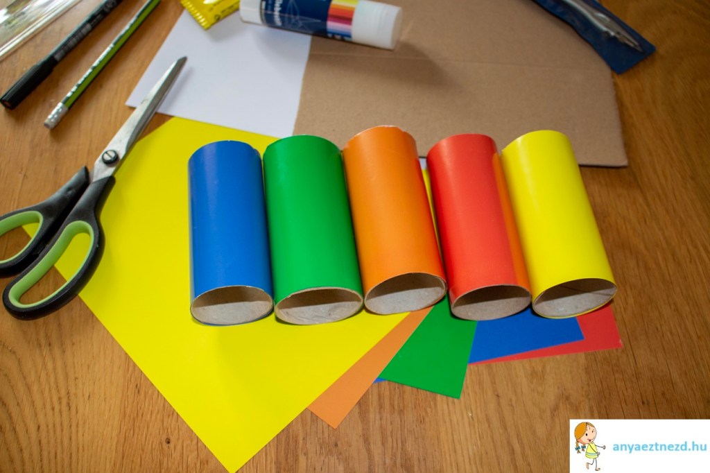 A színeslapokból vágjunk ki akkora téglalapokat, amivel be tudjuk borítani a hengereket és a ragasztóstift segítségével ragasszuk fel.