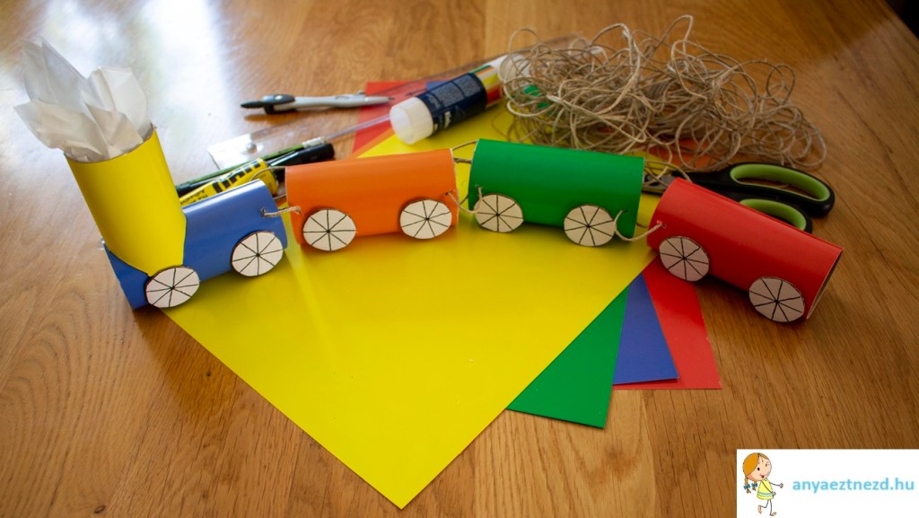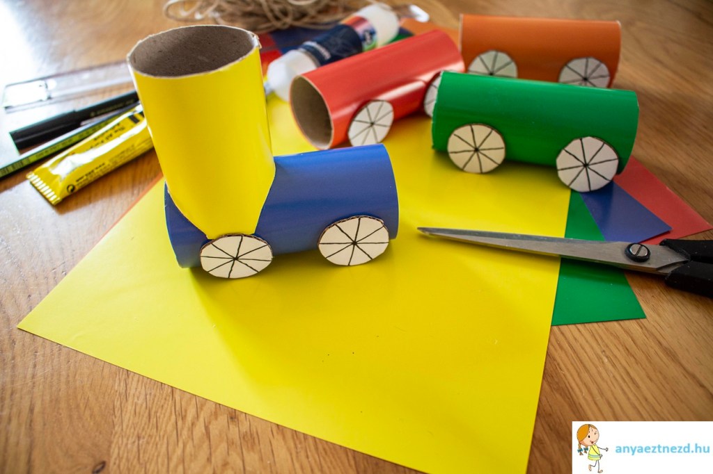 Fúrjunk lyukat a hengerekre és a madzaggal kössük össze őket úgy, hogy a bal és a jobb oldalon is rögzítve legyenek, így nem fognak a vagonok felbillenni.