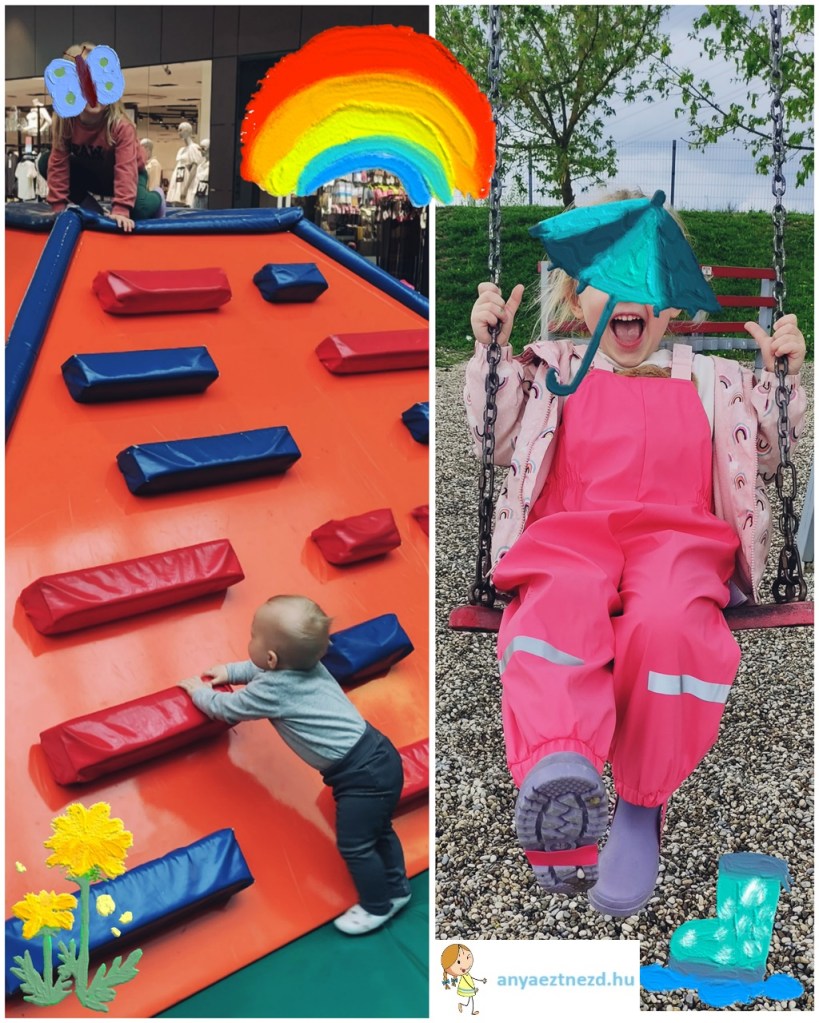 A betegség miatt a Kicsi napirendjének egyetlen pontja sem volt állandó, de azért szakítottunk időt egy kis játszóterezésre esőnadrágban és gumicsizmában, sőt, amikor nagyon beindult a zápor, akkor még egy közeli játszóházba is bementünk, hogy a szinte néptelen szivacskupacok között a baba is ki tudja nyújtóztatni a végtagjait.