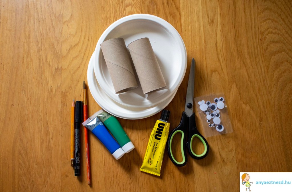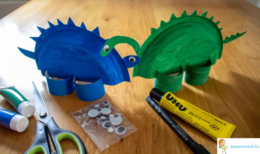 A wc papírgurigákat vágjuk nagyjából háromfelé és két-két korongot vágjunk be vízszintesen. Az így keletkezett résbe állítsuk bele a a dínók testét.
