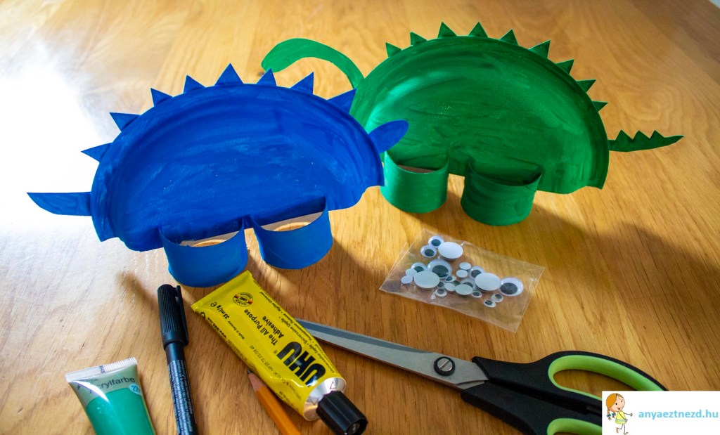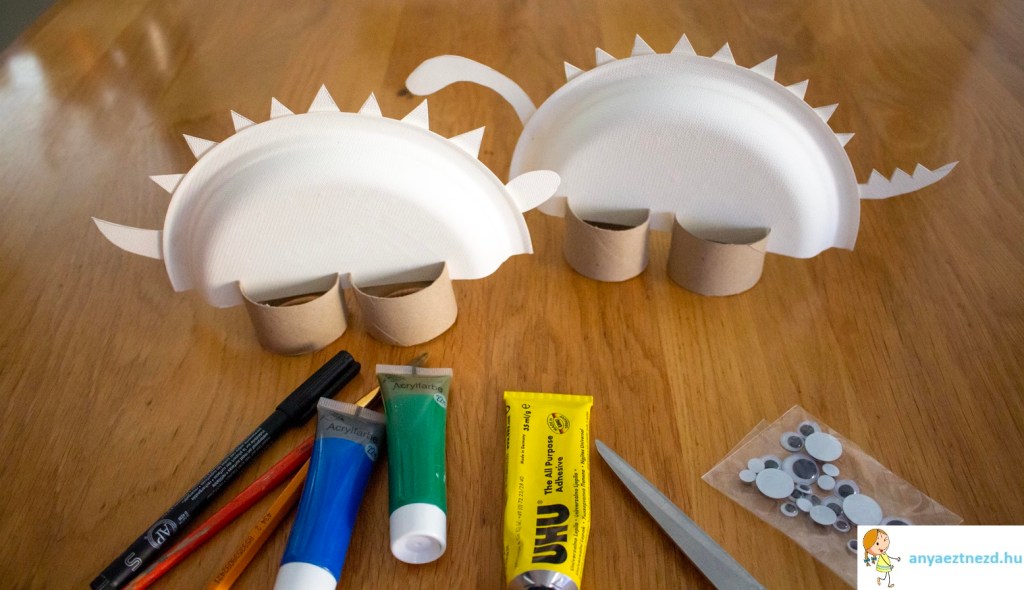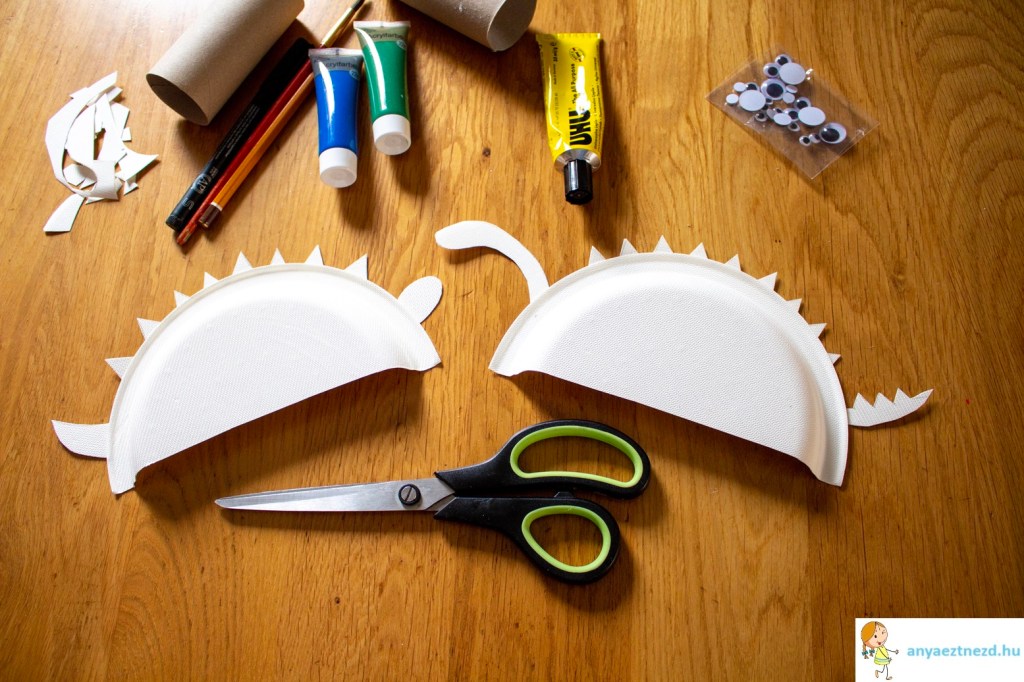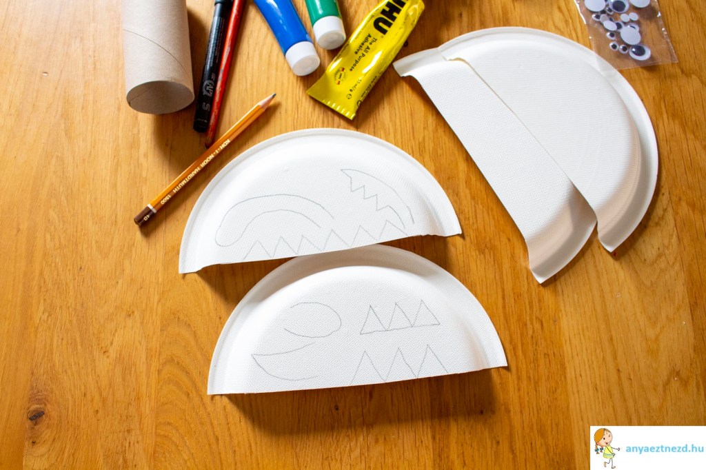 A papírtányérokat vágjuk félbe és két fél tányérra rajzoljuk fel a dínók fejét, a farkukat és a tüskéiket. A tányérok méretétől függően 8-10 háromszög alakú tüskét rajzoljunk.