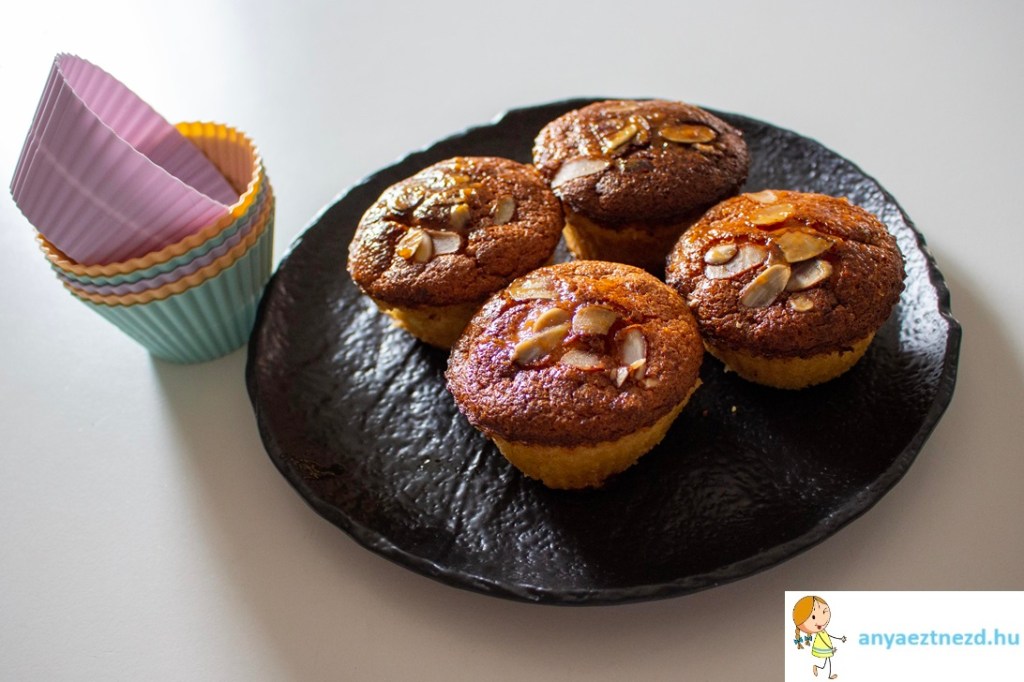 8. Minden muffin tetejére teszünk pár darab szeletelt mandulát, majd betesszük a sütőbe és 45 perc alatt készre sütjük.