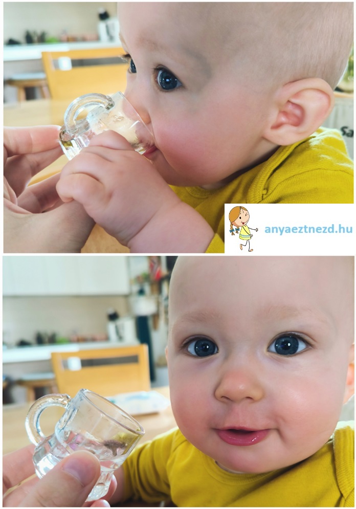 Fogalmam sincs, hogy az mennyiben „köszönhető” a testvéri mintának, hogy semmilyen üvegből nem hajlandó inni, csak és kizárólag a hagyományos poharat fogadja el. Van itthon ezerféle csőrös-, 360 fokos varázspohár, de egyiket sem hajlandó a szájába venni, a legkedvesebb edénye egy pici füles pálinkáspohár. Istenbizony nem kondícionáljuk fiatalkorú anonim alkoholistának, de majd’ kiugrik az etetőszékből, ha csak előveszem és teli szájjal vigyorog, miközben kaja után lehajtja a feles vizet. Lehet, hogy csak simán a cumi és cumisüveg undorral függ ez is össze, vagy elképzelhető, hogy ivásban is a nővére példáját akarja hűségesen követni, nem tudom.