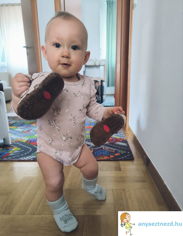 Az utóbbi pár napban nagyon beindult, már 80-90%-ban két lábon közlekedik, egyszer-egyszer fordul csak elő, hogy ráfanyalodik a mászásra, így nem akartam a cipellő beszerzését tovább halogatni.
