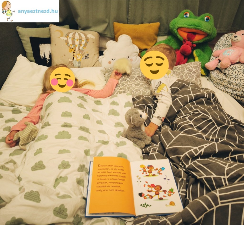 Egy gyors vacsora és fél óra játék után azonban már ágyba tessékeltem őket. A másik szülőpárossal megejtett rögtönzött kérdőívemből ugyan kiderült, hogy ők D.-t valamivel később fektetik, mint mi a Nagyot, de a nálunk szokásos takarodó már így is bő egy órája eltelt, így aztán tényleg legfőbb ideje volt, hogy mindketten nyugovóra térjenek.
