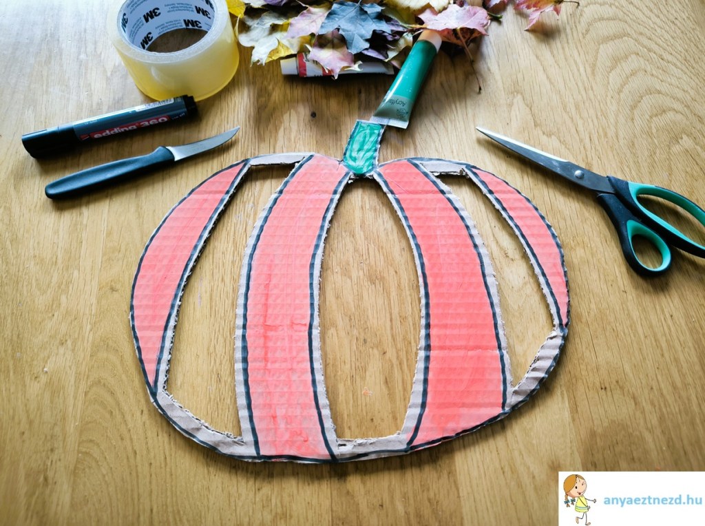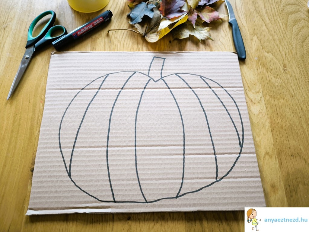 A kartonra a filctollal rajzoljuk fel a tök körvonalait. Az a legoptimálisabb, ha hét részre osztjuk.