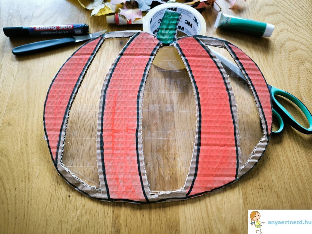 A karton hátára ragasszuk fel a celluxcsíkokat úgy, hogy a ragacsos felületük látszódjon a tök felőli oldalon.