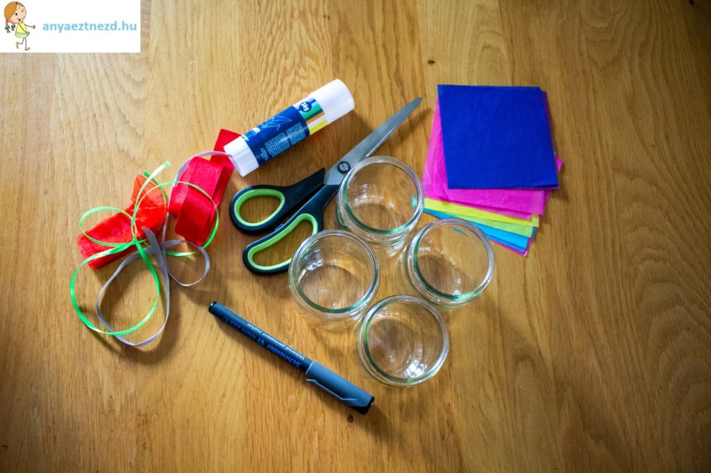 – kisebb befőttesüvegek (én bébiételest használtam, de pl. lekváros is teljesen jó)