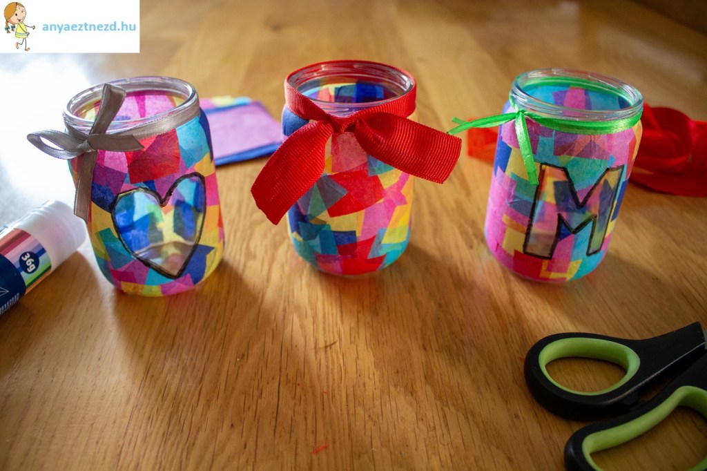 Ha meggyújtunk benne egy teamécsest, akkor a selyempapíron keresztül szépen átragyog majd a fénye. Használhatunk akár szúnyogriasztós teamécsest is, úgy a befőttesüveg lámpás az erkélyen/teraszon is hasznos kellék lehet. 😉