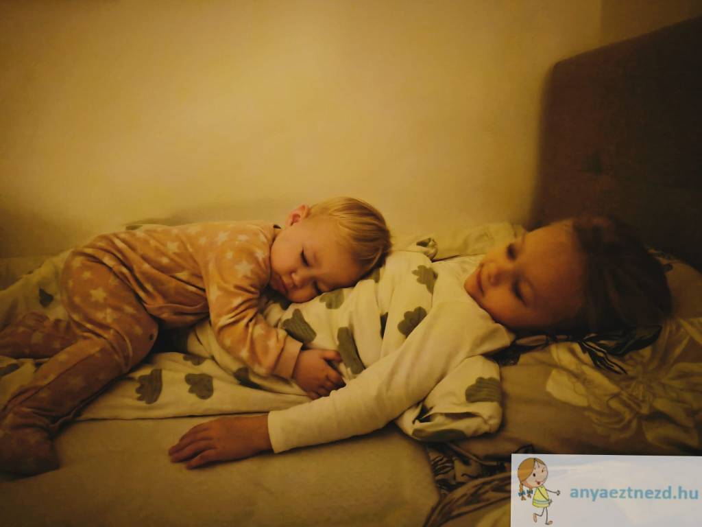 Ez a kép pont valamelyik hajnalban készült, a Nagy ébresztett fel, hogy nézzem meg, hogy hogy ráfeküdt a húga. Teljesen odáig volt! 🙂 Kicsit erősebbre vettem az éjjeli fényt és éjszakai módban lefotóztam őket. 😀