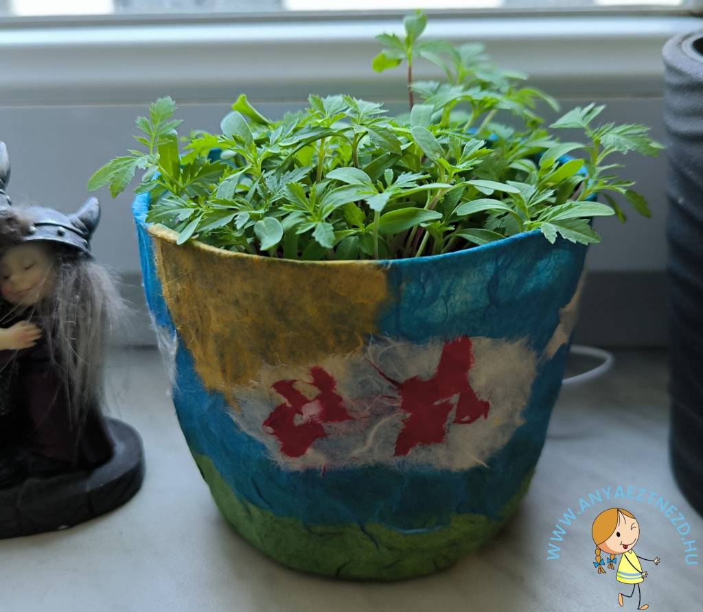 Képzeljétek, egy – minden gyerek által saját kezűleg, az óvónénik felügyelete alatt készített – kaspót kaptunk ajándékba, de természetesen nem üresen! Ugyan csak egy maréknyi, frissen kikelt hajtást láttam a cserépben, de nagyon ismerősnek tűnt a titokzatos növény levele és amikor rákérdeztem az egyik tetától, hogy pontosan mi ez, akkor derült ki, hogy büdöskét ültettek magról a gyerekek – mert az nem finnyás virág és biztosan kikel! 😀
