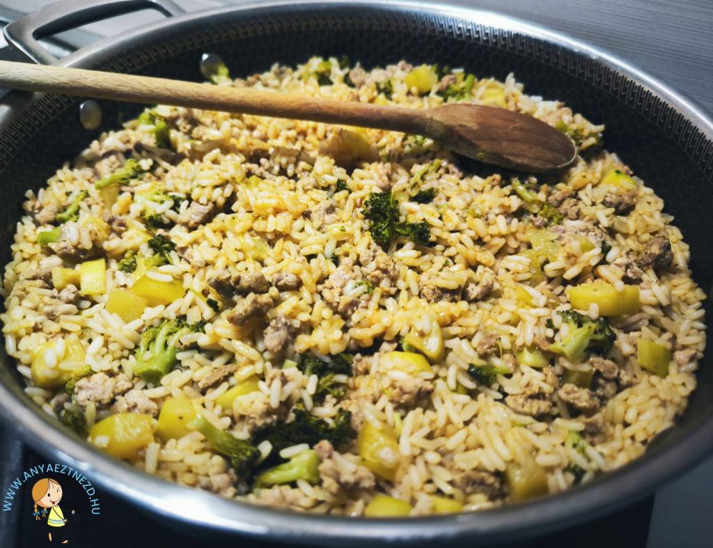 7. Ha a rizs már nem nyers, le lehet venni az edényt a tűzhelyről, nem baj, ha még van a lábasban “felesleges” folyadék. Hagyjuk 10-15 percig fedő alatt állni, amíg a maradék vizet is felszívja és már tálalható is!