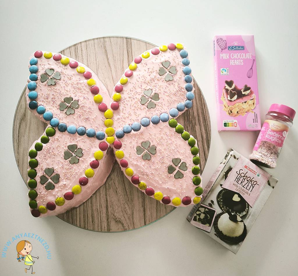 Pillangó alakú tortát szeretett volna és bevallom nőiesen, először eléggé betojtam, hogy hogy fogom kifaragni a lepkeformát a lapokból, de végül egy nagyon egyszerű és könnyen kivitelezhető megoldással a képen látható módon – szerintem egészen felismerhetőre – sikerült.