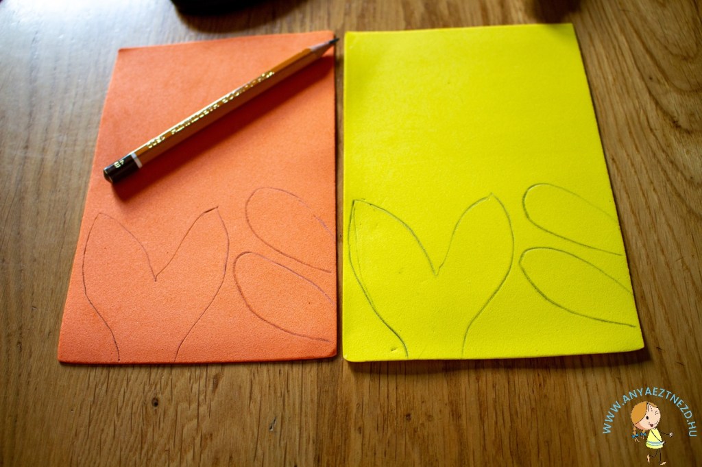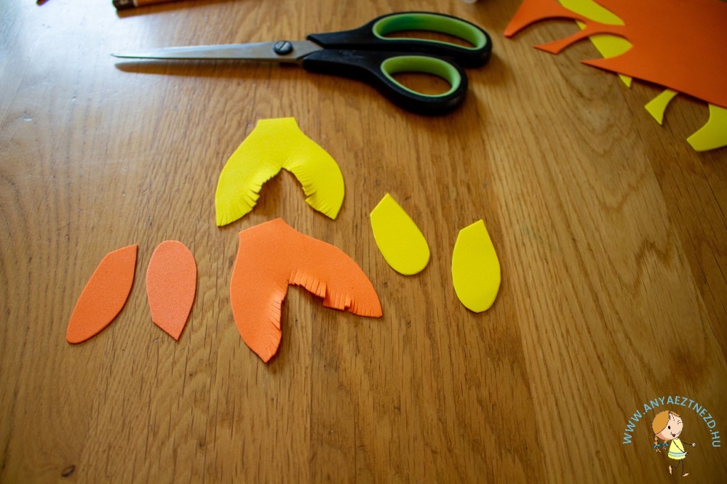 Amíg a festék szárad, a színespapírra vagy a habszivacs lapokra rajzoljuk fel az uszonyokat a képen látható módon.