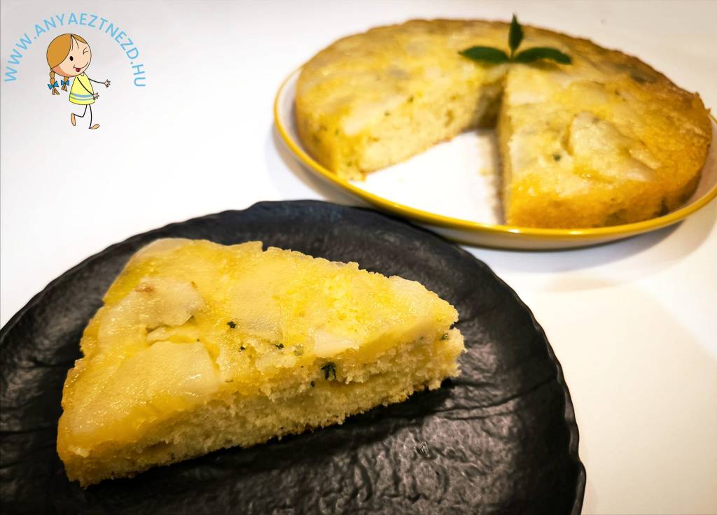 A torta tésztája más – valószínűleg látványosabb és szebb kontrasztot adó – friss gyümölcsökkel is elkészíthető, de én még mindig a gyógynövényes kísérletezős korszakomat élem, ezért körtével és mentával sütöttem meg. 🙂