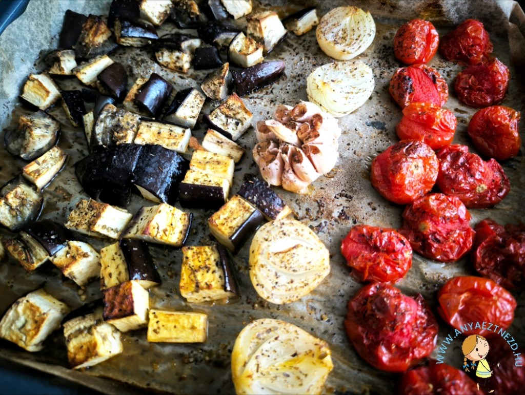 1. A sütőt melegítsük elő 200 fokra és a zöldségeket készítsük elő. A hagymákat pucoljuk meg és vágjuk félbe, a padlizsánt kockázzuk fel, a fokhagyma fejének pedig vágjuk le nagyjából a felső negyedét, hogy a gerezdek láthatóak legyenek (lsd. a fenti képen).