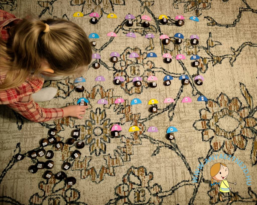 Kartonpapírra felragasztottam a kisbetűket, a gesztenyékre pedig mindegyikük nagy párját, így egy alternatív memóriajátékot alkotva.