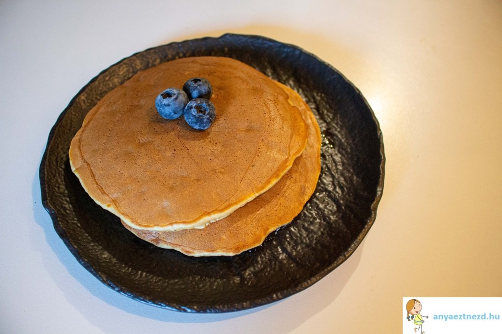 5. Ha felmelegedett a serpenyő, a massza felét (vagy harmadát, ha kisebb palacsintákat akarunk készíteni) beleöntjük és addig sütjük, amíg a szódabikarbóna miatt keletkezett buborékok ki nem pukkanak, majd megfordítjuk és pár másodperc alatt a másik oldalát is készre sütjük.