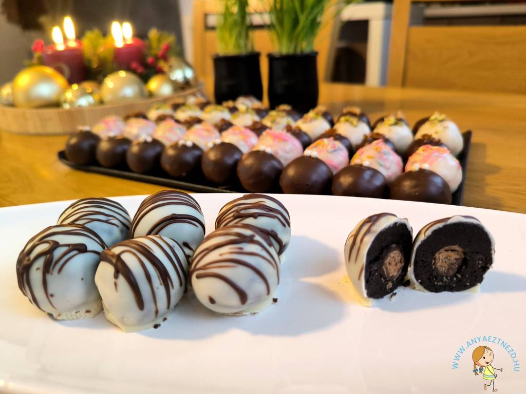 A kekszet egy késes aprító segítségével (a benne lévő krémmel együtt) finomra daráljuk, majd összegyúrjuk a mascarponéval és golyókat formázunk belőle. Bevonjuk őket a gőz felett felolvasztott fehér csokival és díszítésként étcsokit vagy apróra tört Oreo kekszet teszünk a tetejére.