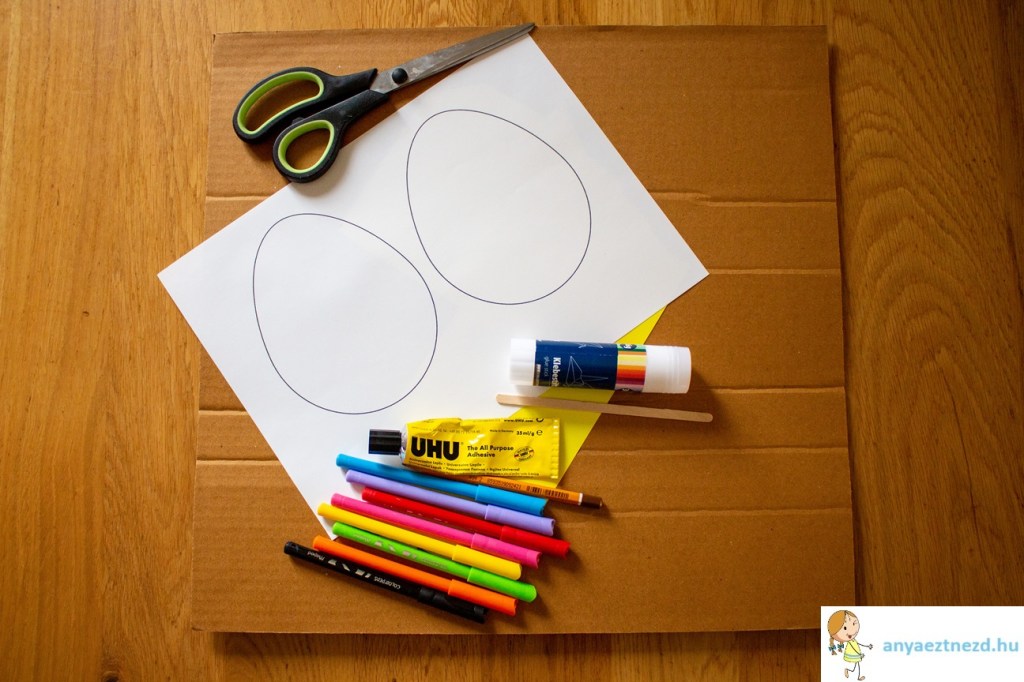 Nyomtassuk ki a tojás körvonalat (a bejegyzés alján letölthetitek) és vágjuk ki a tojásokat. Ha keményebb fehér kartonlapot használunk, akkor rajzoljuk körbe a kivágott tojás formát a lapon.