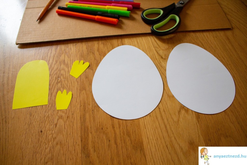 A sárga színeslapból vágjuk ki a csibe testét (lekerekített téglalap alak) és a szárnyait. Figyeljünk, hogy ne legyen nagyobb a tojásnál, mert akkor nem fog beleférni!