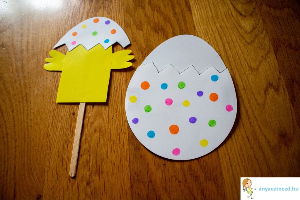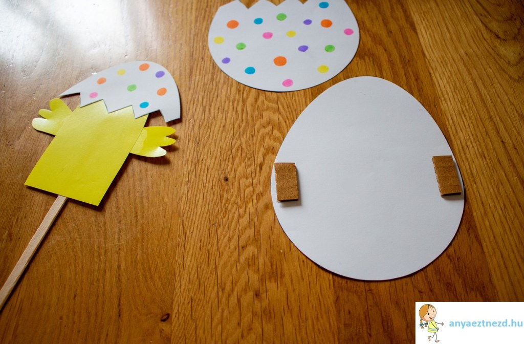 A felrajzolt “törés” mentén vágjuk el a tojást és a kisebbik, felső részt ragasszuk fel a csibe testének a tetejére. Fordítsuk meg a csibét és a hátuljára ragasszuk ra a jégkrémes pálcikát.