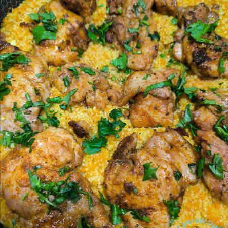 Egyserpenyős csirkecomb zöldséges, fűszeres kuszkusszal
